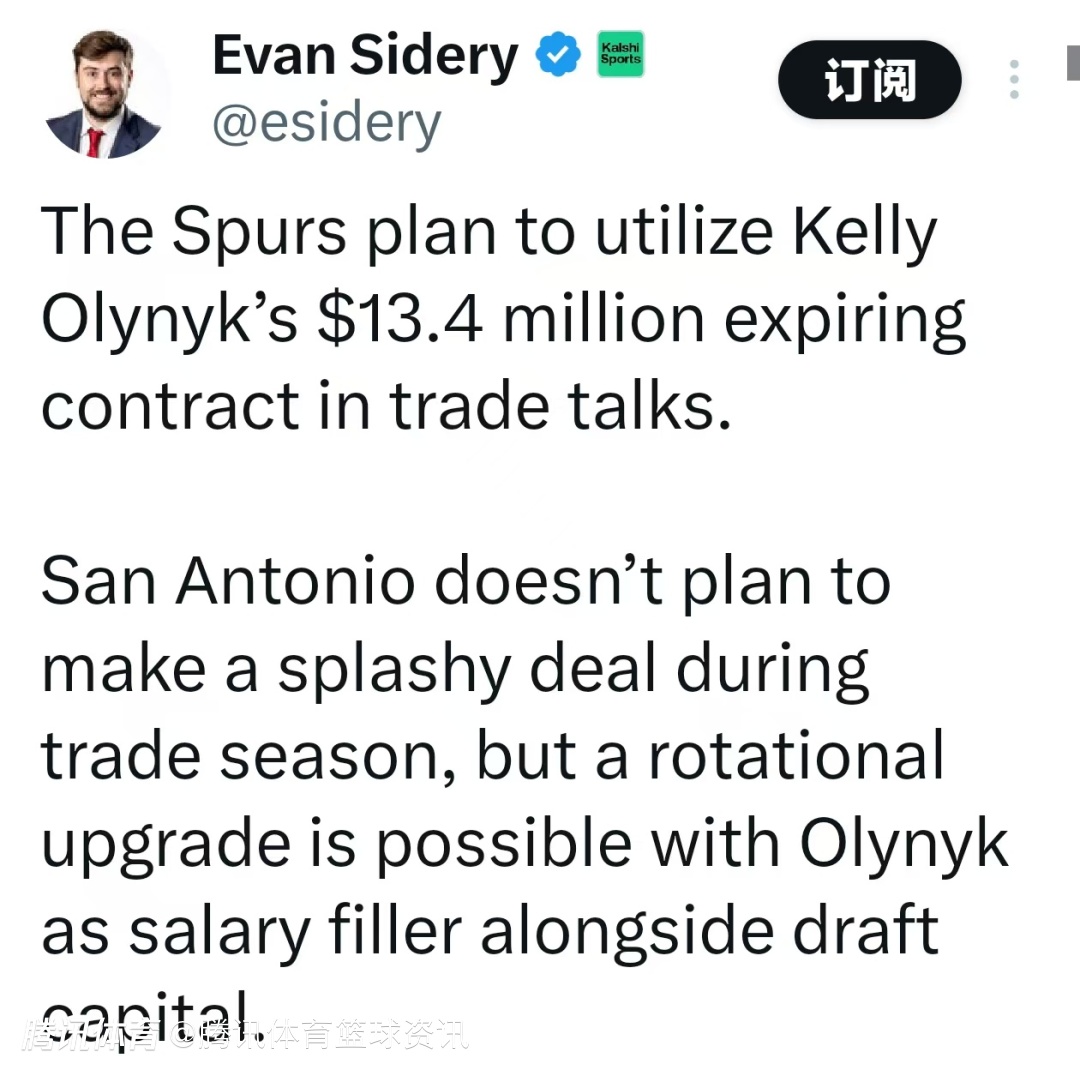 Sidery指出,马刺无意在交易季做大手笔运作,奥利尼克将作为配平筹码搭配选秀权,助力球队升级轮换。