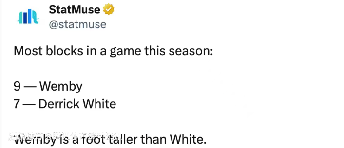 值得一提的是,本赛季单场盖帽数最多的球员,文班亚马以9个暂居首位,怀特则是以7个居次席,而文班亚马比怀特高了约30.48厘米。