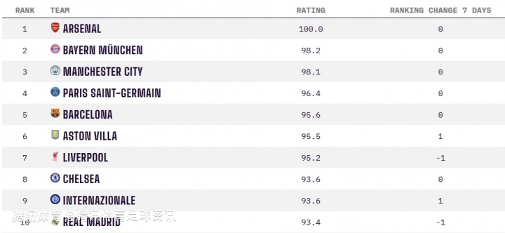 在最新的Opta俱乐部竞技实力年终排名中,阿森纳以满分100分位列第一,拜仁慕尼黑(98.2分)和曼城(98.1分)紧随其后。巴黎圣日耳曼、巴塞罗那分列第四、第五位,阿斯顿维拉高居第六,利物浦排名第七,切尔西与国际米兰并列第八,皇家马德里位居第十。