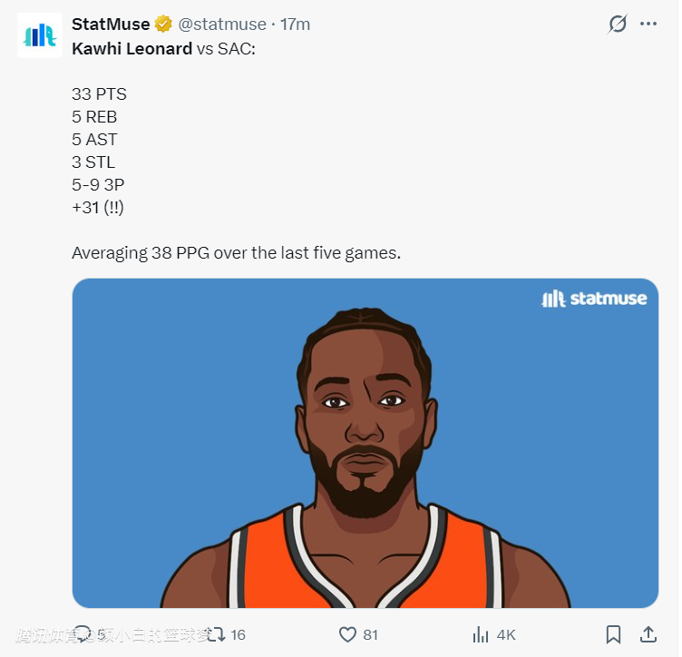 末节国王就没上主力直接缴械投降,但快船这边为了稳定局势,伦纳德、琼斯、桑德斯、巴图姆、尼德豪泽五人继续打,快船再度将分差拉开到40分以上,随后小卡也被换下了,他全场比赛33分5篮板5助攻3抢断1盖帽。