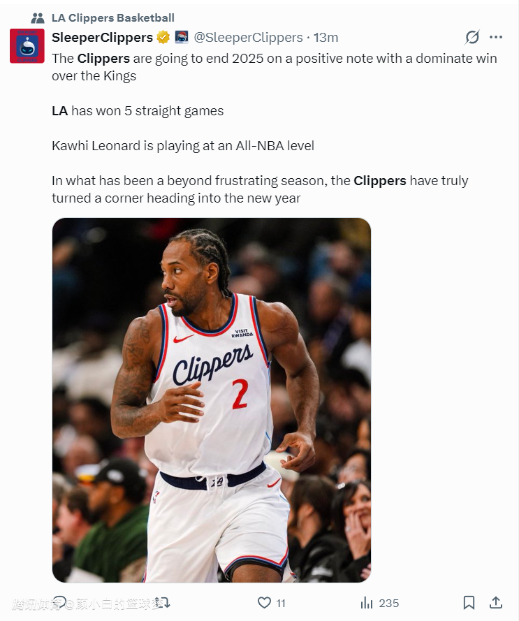 船媒:快船用一场完胜为2025年画上完美句号,我们已经豪取五连胜,莱昂纳德的竞技状态达到最佳阵容级别,在经历了令人沮丧的开赛阶段后,快船在新的一年到来之际迎来了转机。