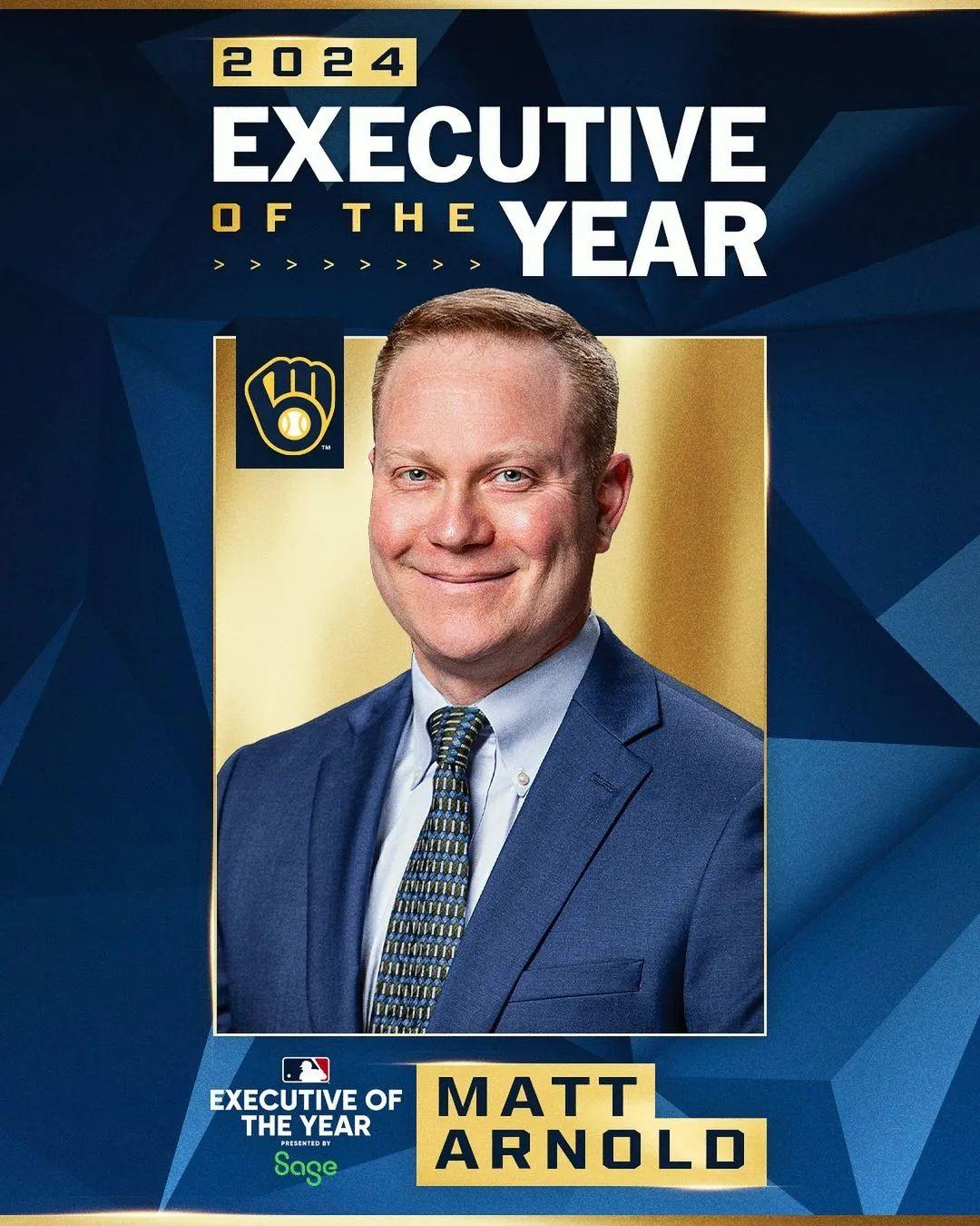 马特-阿诺德成为酿酒人历史上首夺该奖的经理人。这位酿酒人的高层在过去这个赛季做出了许多惊为天人的选择。大合同续约球队板凳教练帕特-墨菲(Pat Murphy)以代替离队的主教练克雷格-康塞尔(Craig Counsell)、以八年8200万的高价签下顶级新秀杰克逊-乔里奥(Jackson Chourio)、交易科尔宾-伯恩斯(Corbin Burnes)都是出自他的手笔。这些大刀阔斧的改革竟使得酿酒人一路过关斩将,闯入季后赛。这一奖项,阿诺德当之无愧。