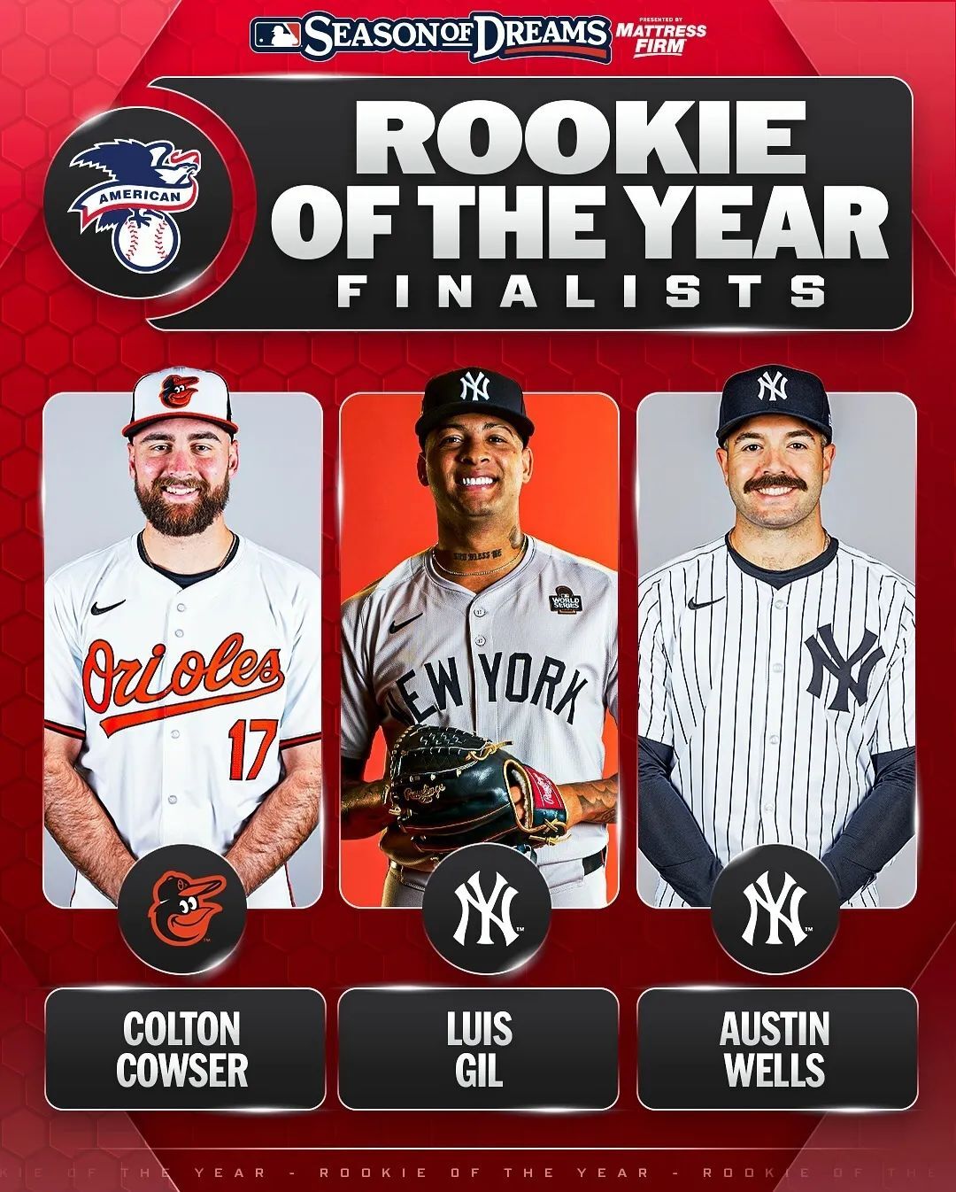 去年,巴尔的摩金莺的冈纳-亨德森(Gunnar Henderson)(美联)以及亚利桑那响尾蛇的科尔宾-卡罗尔(Corbin Carroll)(国联)分别获得了此殊荣。