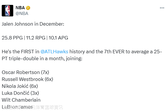 根据NBA官方发布的数据统计显示,杰伦-约翰逊在12月交出了统治级数据答卷:场均砍下25.8分、11.2个篮板、10.1次助攻。这一表现不仅让他成为老鹰队史首位达成单月场均25+三双的球员,更跻身NBA历史殿堂,成为联盟史上第7位解锁这一成就的球员。