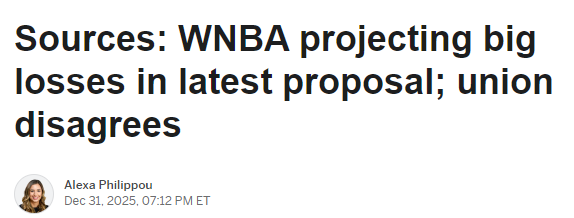 多位熟悉谈判内情的消息人士向ESPN透露,球员工会(WNBPA)近期提交了一份提案,计划让球员分得联盟约30%的总收入,同时将工资帽设定在1050万美元左右。而WNBA方面测算后认为,若按这份提案执行,在新劳资协议有效期内,联盟将累计亏损7亿美元。消息人士指出,如此巨额的亏损会严重危及联盟的财务健康,其数额甚至超过了WNBA创立29年来联盟及各球队的亏损总和。