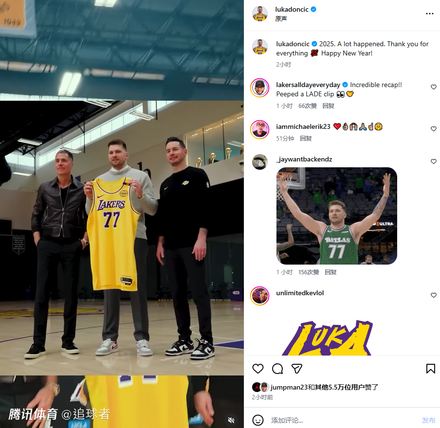 湖人另一球星东契奇则是深情告别2025年,他在社媒上晒出一条长达10分钟的视频,配文写道:2025年发生了很多事,感恩所有经历,新年快乐!