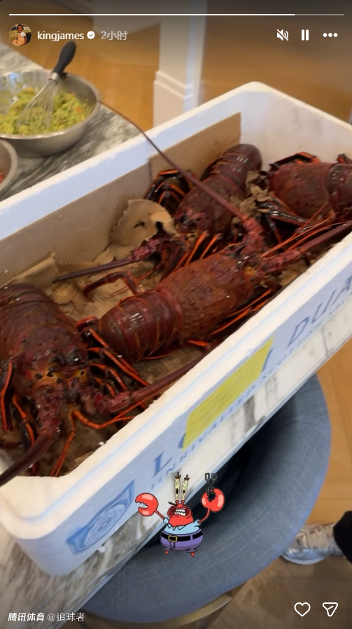 美国当地迎来跨年夜,詹姆斯在社交媒体上晒出跨年夜晚餐,一箱鲜活的龙虾待吃,视频中老詹开怀大笑很开心;詹姆斯刚刚迎来自己的41岁生日,在没有比赛的日子里,他陪伴家人一起跨年。