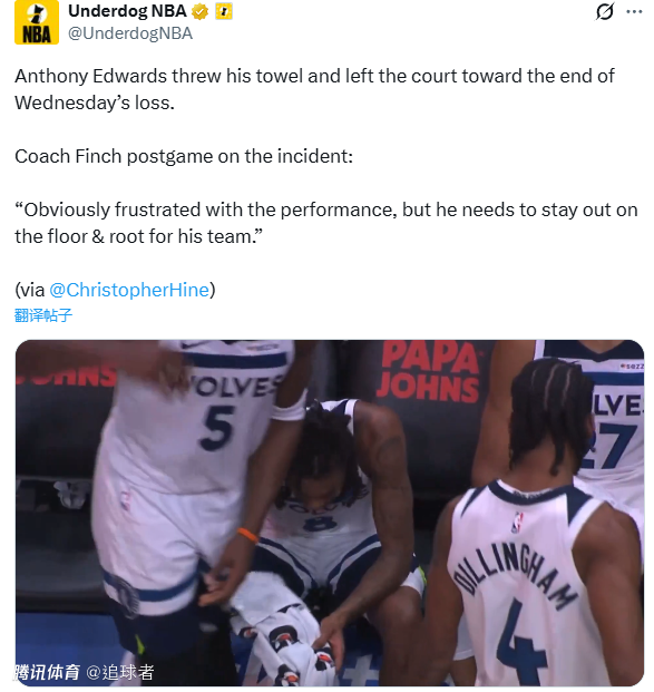 森林狼主帅芬奇喊停比赛并且撤下主力,爱德华兹失落下场,之后他怒扔毛巾泄愤,而且径直离场返回更衣室,提前离场太沮丧,最终回家之战遭遇24分惨败。