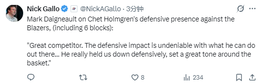 戴格诺特在谈到霍姆格伦单场6次盖帽的表现时说道:“他是一名极具竞争力的球员,在防守端的影响力毋庸置疑,他确实在防守端为球队筑牢了防线,为内线防守奠定了坚实的基调。”