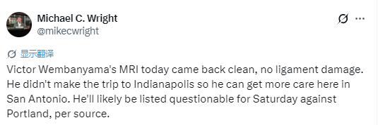 据悉,为了能在圣安东尼奥接受更全面的康复治疗,他并未跟随球队出征印第安纳波利斯。不出意外的话,在周日对阵开拓者的比赛中,文班亚马的出战状态大概率会被列为出战成疑。