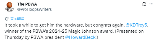 PBWA主席霍华德-贝克表示:“我们非常荣幸能再次将奖项颁给KD。长久以来,他都是联盟中最具思想深度、也最乐于配合采访的球星之一。无论正式的公开采访,还是轻松的闲聊时刻,他总会抽出时间接待记者,从不回避任何话题。不管是拆解某一回合的战术细节,还是探讨联盟面临的宏观议题,他都表现得兴致盎然,对篮球的热爱溢于言表。另外,我们协会成员也十分赞赏杜兰特在疫情后公开呼吁重开球员更衣室的举动,他深知这种采访权限,是搭建球员与记者之间信任与默契的关键所在。”