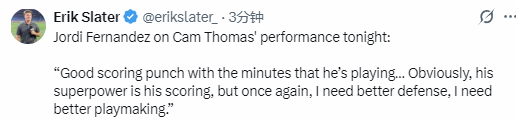 在谈到卡姆-托马斯的表现时,费尔南德斯说道:“他今晚在进攻端的效率相当不错,但控制失误方面还有很大的提升空间,处理球需要更谨慎。防守端的防守轮转和站位也需要更扎实。不过以他目前的上场时间来看,他的得分火力还是很可观的。现在最重要的是观察他的身体在连续征战后的反应,这是他伤愈复出的第三场比赛,考虑到他之前的伤病情况,这一点非常关键。显然,得分是他的强项,但我还是需要他在防守和组织方面做得更好。”
