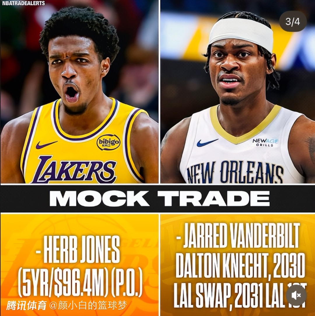 先用范德比尔特、克内克特、湖人2030年首轮互换权、2031年首轮签去换琼斯,因为琼斯是三号位,跟詹姆斯搭档最需要的是三号位而不是阿彪、八村垒这种四号位,现在的詹姆斯很难去防守速度更快的SF。