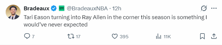 火箭记者Bradeaux继续写道:本赛季塔里-伊森的三分表现竟然跟雷阿伦如出一辙,这让我意想不到。