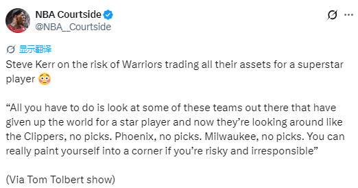 科尔说道:“你只要看看联盟里那些球队就懂了,为了得到一位球星赌上全部家底,如今全陷入了进退两难的境地。快船,没选秀权了;太阳,没选秀权了;雄鹿,也没选秀权了。如果球队决策既激进又盲目,那真的会把自己逼进死胡同。”