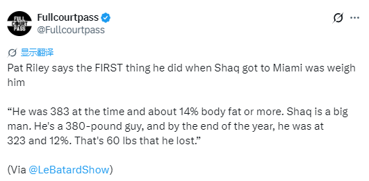 “当年奥尼尔来的时候,是他自己想来这儿的。我永远忘不了他刚来球队时,我做的第一件事就是给他称重。他当时表现得还不错,对一切都很坦诚。我知道奥尼尔的油箱里还有油,我知道他有这个能力。当时他的体重是383磅(约174公斤),体脂率大概在14%甚至更高。”