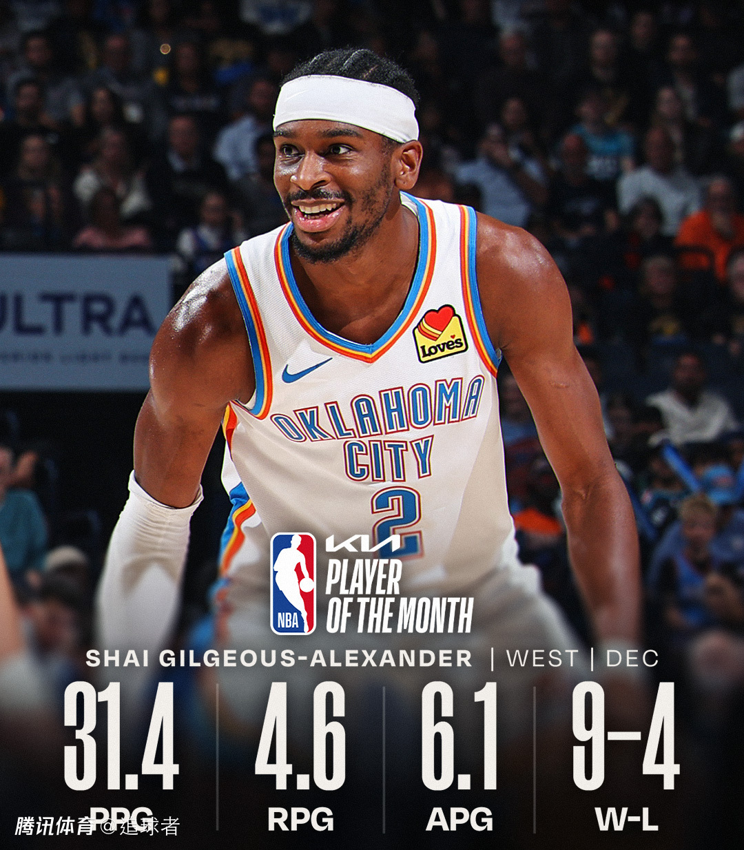 本赛季,亚历山大又打出MVP级别的统治力,而且他刚刚荣获12月西部月最佳球员,在刚刚过去的12月份,亚历山大场均轰下31.4分6.1助攻,投篮命中率高达59.4%,带领雷霆9胜4负,力压詹姆斯、杜兰特、库里、约基奇、小卡等获提名球星,荣获西部月最佳。