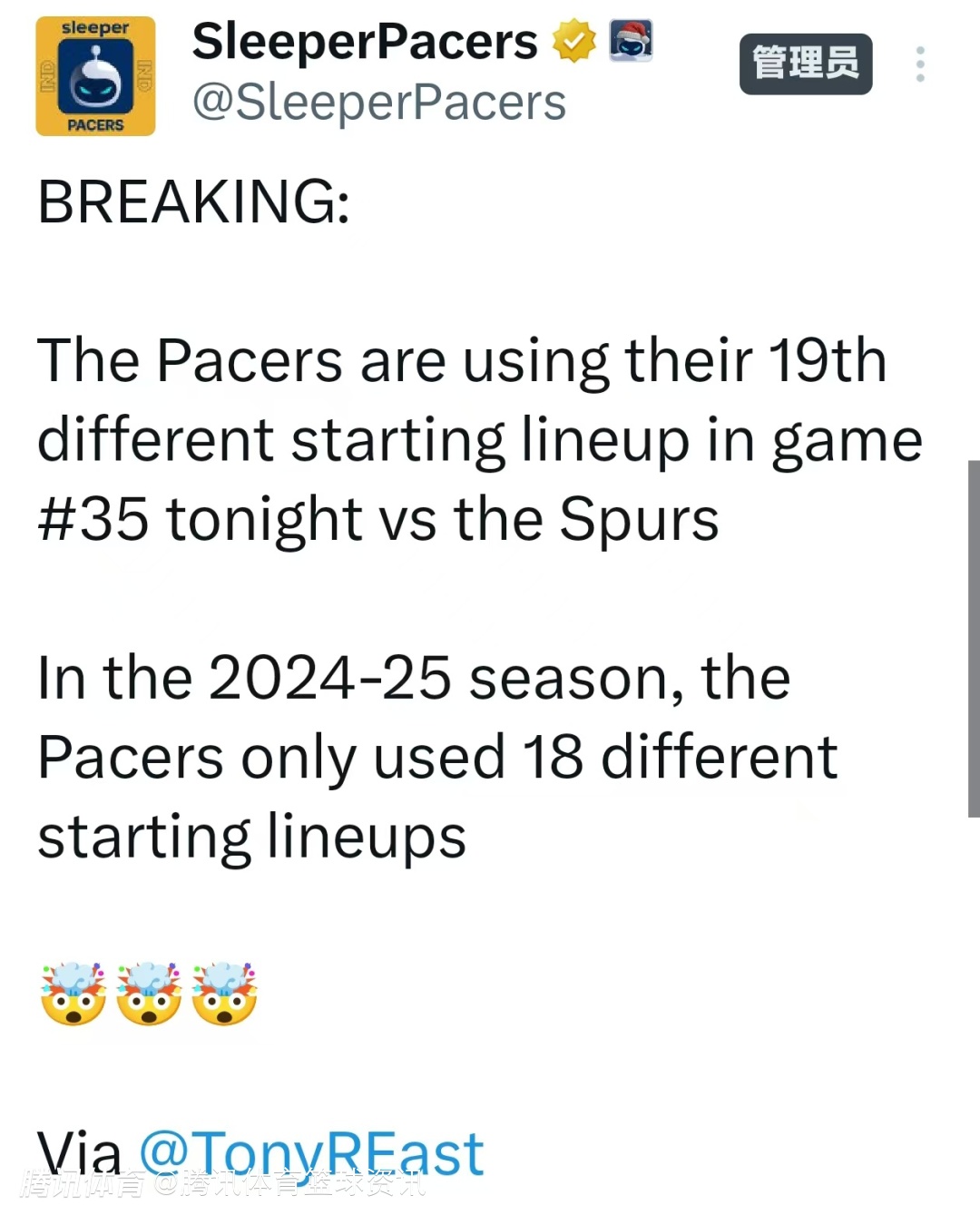 步行者首发阵容又双叒变了:本赛季至今第19套 上赛季总共才18套