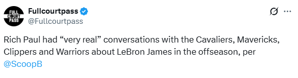 据名记Scoop Robinson报道,里奇-保罗曾在休赛期与骑士队、独行侠队、快船队和勇士队就勒布朗-詹姆斯交易进行了“非常真实的”对话。消息人士称,关于勒布朗-詹姆斯可能被交易的传闻并非只是‘烟雾弹’或典型的休赛期炒作。用相关人士的话来说,这些谈判‘非常真实’。