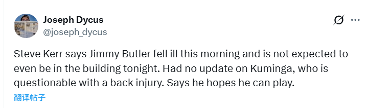 科尔同时透露,巴特勒是今早突发疾病,预计今晚不会前往球馆。至于背部不适、出战成疑的库明加,科尔暂时没有更新他的状况,只是表示希望库明加能够出战。