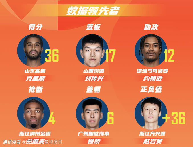 山东男篮球员克里斯以单场36分的数据领衔得分榜; 山西男篮球员刘传兴以单场17个篮板的数据领衔篮板榜; 深圳男篮球员约翰逊以单场12次助攻领跑助攻榜; 浙江男篮球员兰道夫以单场4次抢断的数据领衔抢断榜; 广州男篮球员徐昕以单场6次封盖的数据领跑盖帽榜; 浙江广厦球员赵岩昊以+36的正负值领先。