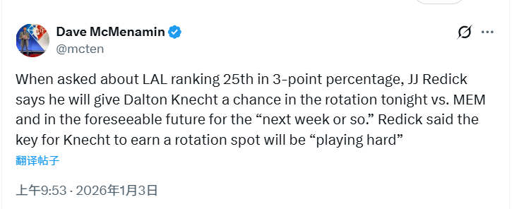当被问及湖人三分命中率排名联盟第25位的问题时,雷迪克表示,他会在今晚对阵灰熊队的比赛中,给克内克特一个进入轮换阵容的机会,并且在未来约一周左右的时间里,都会延续这个安排。雷迪克称,克内克特想要站稳轮换阵容的关键,在于全力以赴去拼。