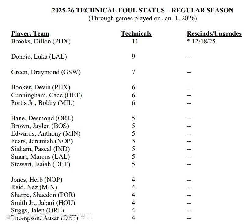 2026-01-03 10:50北京时间1月3日,NBA常规赛继续进行,太阳队对阵国王队。首节比赛结束前8分52秒,太阳队球员狄龙-布鲁克斯因不满判罚吃到技术犯规。