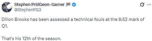 这是狄龙本赛季个人所领到的第12次技术犯规,目前排在NBA所有球员之首。排在他身后的球员是湖人队的东契奇。此外,太阳队球员布克、活塞队球员坎宁安和雄鹿队球员波蒂斯均吃到6次技术犯规。NBA规定,一名球员在常规赛中获得16次技术犯规后,将被自动禁赛一场,之后每增加2次技术犯规,会再被追加禁赛一场。