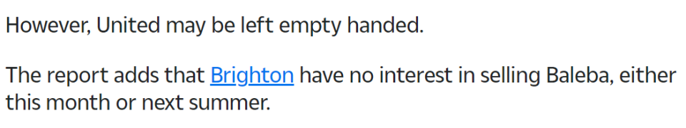 巴莱巴本人非常乐意加盟曼联,老特拉福德自然是比布莱顿更大的舞台,而且可以提供更高的收入。然而布莱顿认为,一名球员如果为了转会不好好踢球,那对任何一方都没有好处。鉴于曼联连续两个转会窗故意扰乱布莱顿球员的专注,他们也打算强势反击,如果报价无法达到本队的要求,就不出售巴莱巴,包括1月份冬季转会窗和今夏的转会窗!
