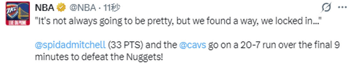 2026-01-03 12:10北京时间1月3日,NBA常规赛继续进行,掘金队108-113不敌骑士队。多诺万-米切尔此役24投14中得到33分6篮板5助攻1抢断,在场正负值+10。赛后,米切尔接受媒体采访。