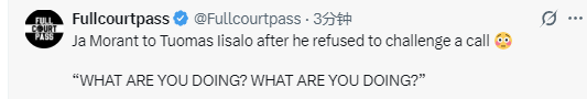 2026-01-03 12:20北京时间1月3日,NBA常规赛继续进行,灰熊队对阵湖人队。首节比赛中,当莫兰特一次上篮不中后想要主教练伊萨洛进行挑战,但托利索拒绝,而这导致了莫兰特的暴怒。