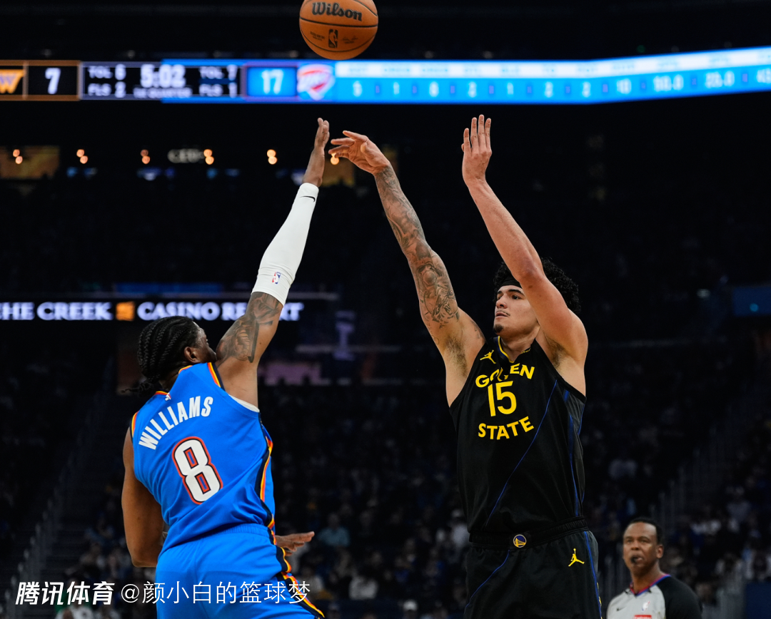 末节勇士这边还是常规轮换,戴姆波特是用米切尔、以赛亚-乔、维金斯、肯里奇、卡尔森的阵容,这套阵容算是雷霆的第三阵容,雷霆用发展联盟阵容打勇士第二阵容,雷霆还继续扩大分差,比赛走入垃圾时间。