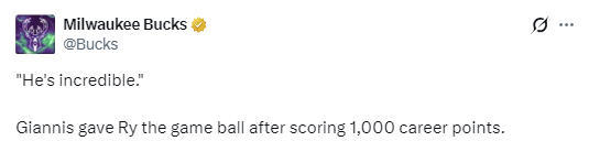 在谈到罗林斯生涯总得分突破1000分时,字母哥说道:“他太出色了,真的不可思议。里弗斯教练把比赛用球给了我,但我觉得把球留给他会是个很棒的举动。作为球队领袖,我认为当队员们专注于做正确的事,每天都努力训练,时刻为球队待命时,你就应该尽可能地去奖励他们。”