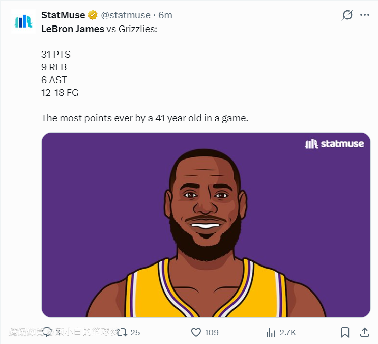 全场比赛,詹姆斯36分钟,18中12,罚球6中6,拿到31分9篮板6助攻,命中率66.7%,41岁的詹姆斯拿到30+又刷纪录。