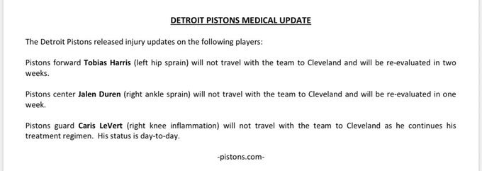 活塞更新伤情报告:哈里斯至少还缺席5场杜伦一周后复查 勒维尔处于每日观察状态
