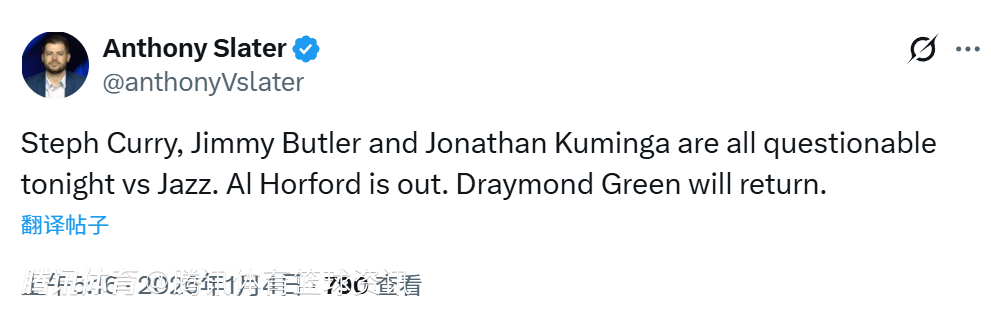 2026-01-04 06:20北京时间1月4日,NBA常规赛继续进行,勇士对阵爵士。赛前,勇士方面更新本场比赛球队伤病报告,库里、巴特勒与库明加均为出战成疑状态,霍福德确定缺阵,追梦则将迎来复出。