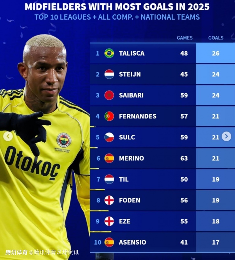 2026-01-04 07:10北京时间1月4日,《转会市场》统计了2025年各项赛事中,在前十联赛效力的中场球员于俱乐部及国家队层面的进球数据,其中塔利斯卡排名榜首。