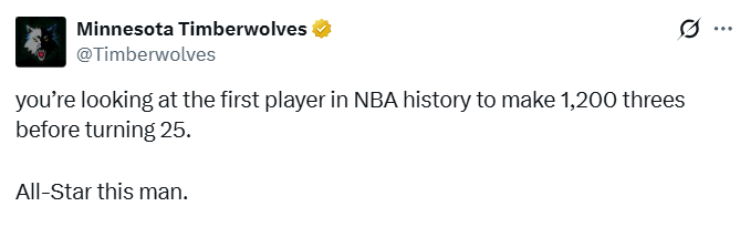 2026-01-04 08:20北京时间1月4日,NBA常规赛继续,森林狼对阵热火。比赛进行过程中,森林狼球星爱德华兹投进3记三分,他职业生涯三分命中数就此突破1200记,成为25岁以前首位达成此成就的球员。