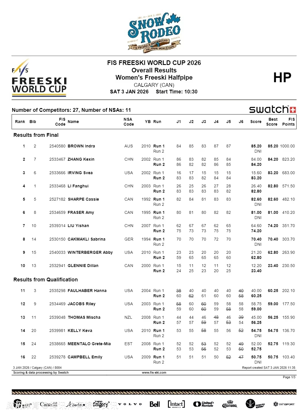 2026-01-04 08:30北京时间1月4日,自由式滑雪世界杯U型池加拿大站比赛结束,中国选手张可欣以84.20分夺得银牌。澳大利亚15岁小将布朗以1分优势首次登顶世界杯,美国厄文落后张可欣1分摘得铜牌。资格赛排名榜首的李方慧名列第四,刘奕杉排名第七。
