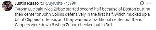 在谈到下半场让祖巴茨首发的安排时,卢表示:“这完全是根据比赛走势做出的调整。我发现他们用五号位去盯防科林斯,这直接打乱了我们的进攻节奏,我们的进攻打得很不顺畅。我觉得让祖巴茨这样的传统五号位上场,对我们会更有利。而且第三节开局我们打得不错,只是没能把这种状态保持下去。”