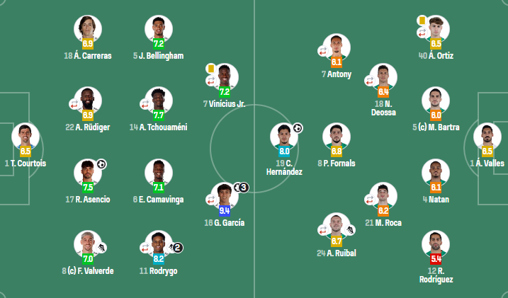 皇家马德里:库尔图瓦;巴尔韦德,劳尔-阿森西奥,吕迪格(88'门迪),卡雷拉斯;罗德里戈(77'居莱尔),卡马文加,琼阿梅尼(81'塞瓦略斯),贝林厄姆;冈萨洛-加西亚(88'弗兰-加西亚),维尼修斯(77'马斯坦托诺)