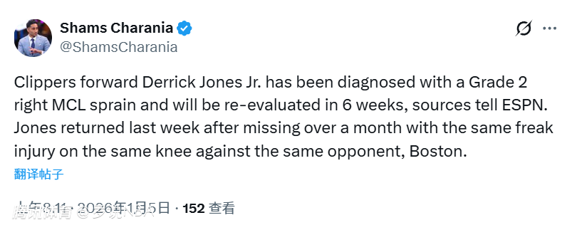 2026-01-05 08:20北京时间1月5日,据名记Shams报道,消息源透露,快船队前锋小德里克-琼斯被诊断为右膝内侧副韧带二级扭伤,六周后将重新评估伤情。上周他才刚刚伤愈归队,此前他曾因同一膝盖、在对阵同一对手凯尔特人时遭遇的同一意外伤病,缺席了一个多月的比赛。