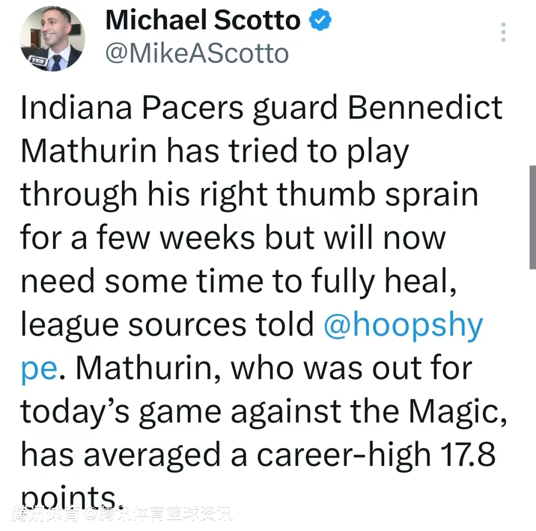 据记者Michael Scotto报道,马瑟林此前几周一直带伤作战(右手拇指扭伤),但目前看来,他将需要一段时间来进行彻底的康复治疗。