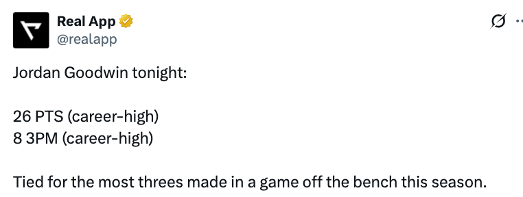 本场比赛,古德温替补出战30分钟,投篮16中9,三分球13中8,拿到26分4篮板。其中得分和三分球命中数都是生涯新高。末节还剩下1分多钟的时候,古德温才命中了本场比赛的第一个两分球,值得一提的是,他追平了本赛季替补球员单场三分球命中数的最高纪录。