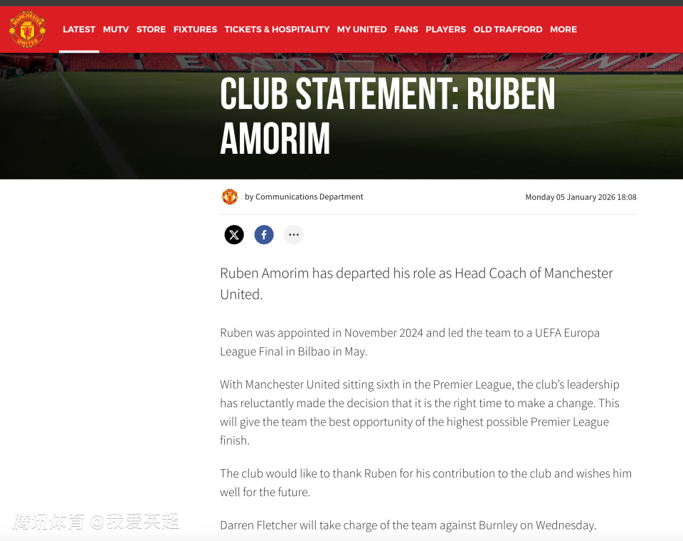 2026-01-05 18:30北京时间1月5日,英超豪门曼联俱乐部,官方宣布正式解雇了40岁的主帅鲁本-阿莫林。前中场球员、现任U18主教练达伦-弗莱彻将暂时接任主教练一职。他的首场比赛将是周三晚客场挑战伯恩利,而曼联新帅正式任命,可能要等到夏季才会公布。