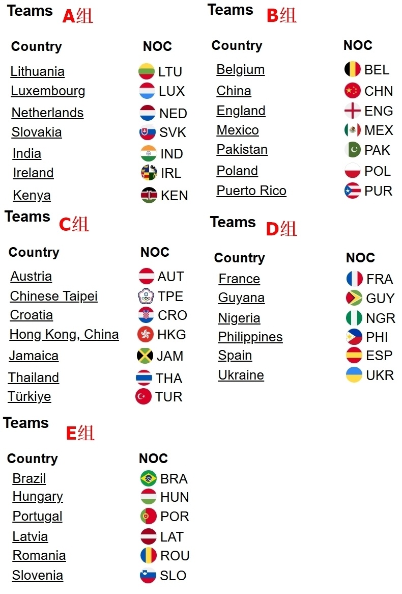 共有包括中国在内的33支队伍参赛,他们被分成5个小组—A/B/C组7对;D/E组6对。