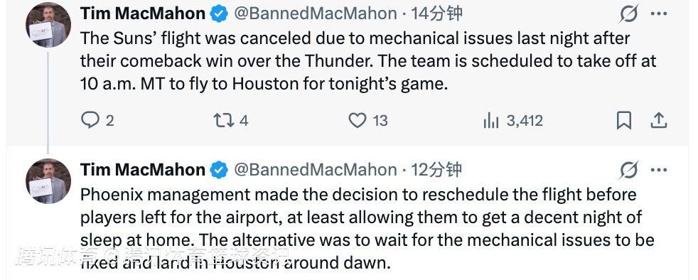 随后麦克马洪透露,太阳管理层在球员前往机场前决定重新安排航班,至少让球员们能在家睡个好觉。原本的备选方案是等待机械故障修复,那样球队要到黎明时分才能抵达休斯顿。