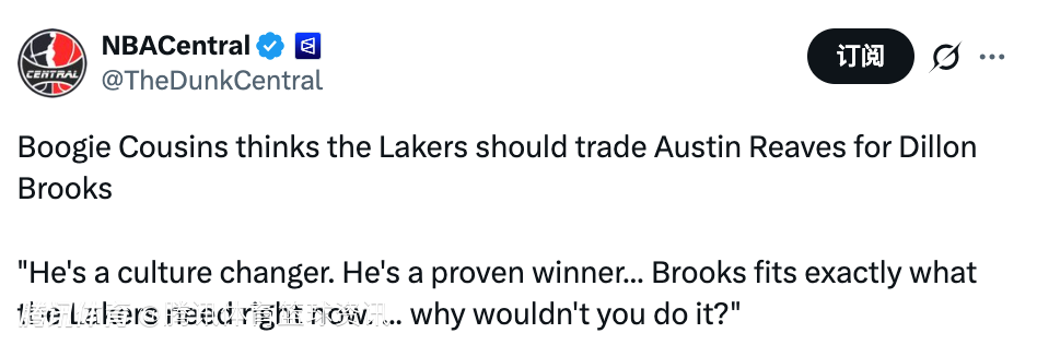 2026-01-06 01:20北京时间1月6日,近日,前NBA球星考辛斯谈到了湖人的情况,他表示湖人应该用里夫斯去交易得到狄龙。
