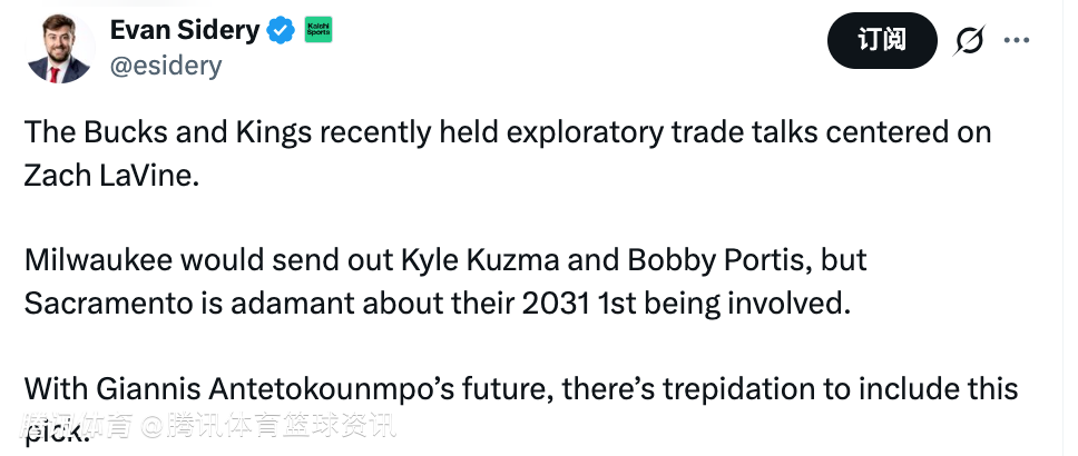 据悉,雄鹿方面愿意送出库兹马和波蒂斯,但国王坚持要求将雄鹿的2031年首轮选秀权纳入交易筹码。考虑到字母哥的未来去向尚未确定,雄鹿对于将这个选秀权放进交易中持谨慎态度。