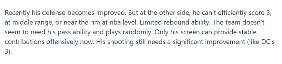他的防守表现近来已有明显进步,但在进攻端,以NBA的水准来看,无论是三分投射、中距离得分还是篮下终结,他的效率都十分低下。篮板能力同样受限,球队似乎并不需要他的传球组织能力,他在场上的处理球也显得比较随意。如今在进攻端,他唯一能稳定为球队贡献的,就只有掩护质量。他的投篮能力仍需大幅提升——比如像克林根那样的进步。